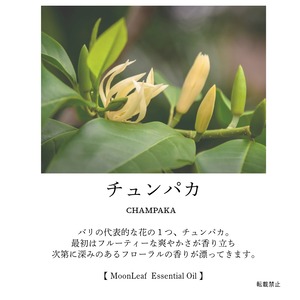 華やかでやわらかな香りが広がるチュンパカのエッセンシャルオイルです。ほんのり甘くフローラルな香りが、優雅で明るい空気を演出します。特別な時間や心地よいひとときにおすすめの香りです。