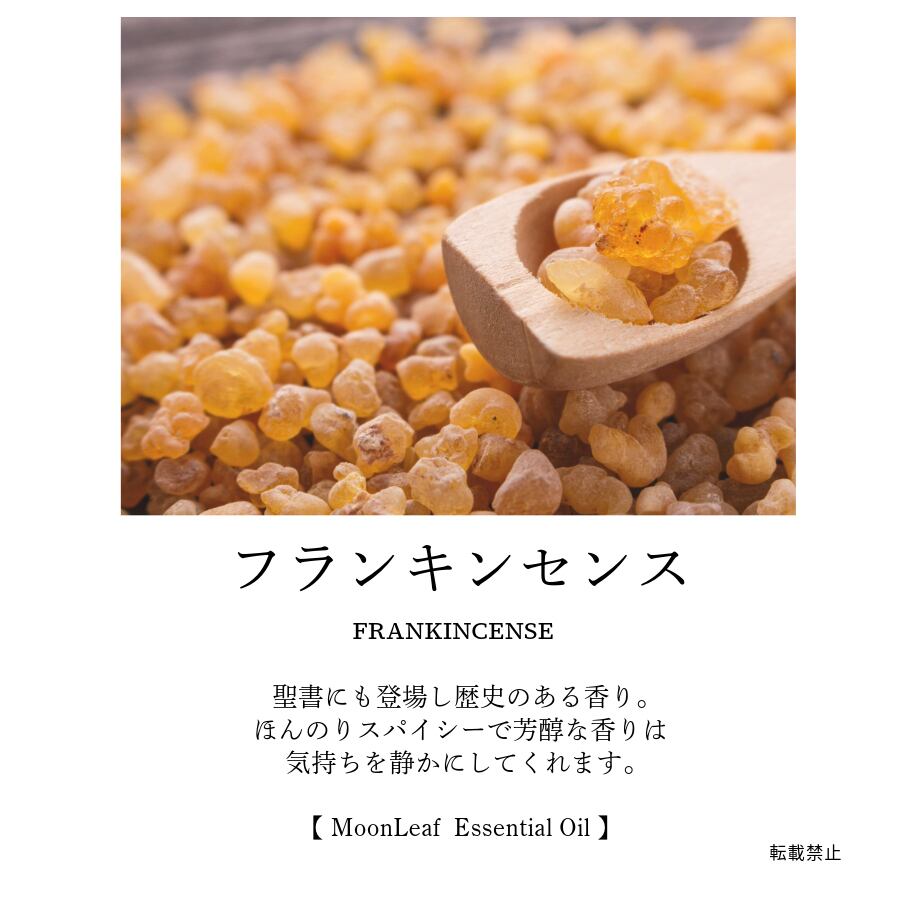 深みのある樹脂の香りが広がるフランキンセンスのエッセンシャルオイルです。落ち着きのあるやさしい香りが、静かで穏やかな空気を演出します。ゆったりとしたひとときや、落ち着いた香りに包まれたい時間におすすめです。